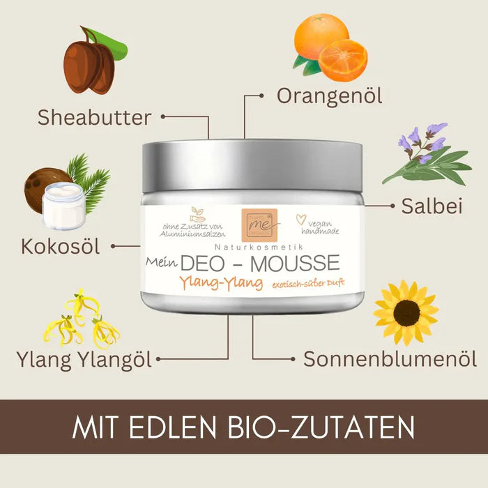 Das Deo‑Mousse Exotik Ylang Ylang ist die ideale Wahl für alle, die einen warmen, blumigen Duft lieben und gleichzeitig Wert auf natürliche, hautfreundliche Pflege legen. Die luftige Mousse‑Textur lässt sich besonders angenehm auftragen, zieht schnell ein und pflegt die empfindliche Achselhaut mit hochwertigen Pflanzenölen. Die natürliche Wirkformel schützt zuverlässig vor unangenehmen Gerüchen – ganz ohne Aluminium, Alkohol oder synthetische Duftstoffe.