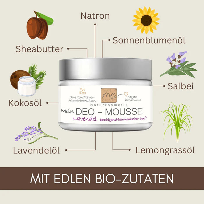 Die pflegende Basis aus BIO‑Sheabutter, Kokosöl und Traubenkernöl beruhigt die Haut und stärkt die natürliche Hautbarriere. Natron, Zinkoxid und Bio‑Maisstärke neutralisieren geruchsbildende Bakterien zuverlässig, ohne das natürliche Schwitzen zu blockieren. Lavendelöl wirkt antibakteriell, entspannend und hautberuhigend. Salbei‑ und Schachtelhalm‑Extrakt unterstützen die Hautregeneration und wirken leicht adstringierend.