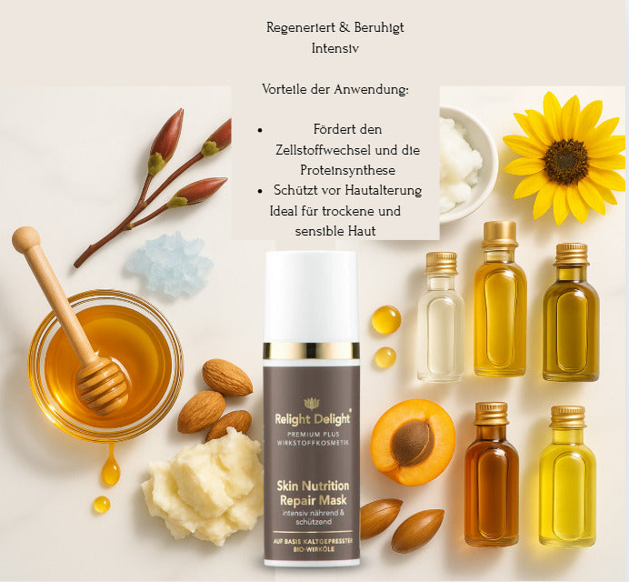 Unsere Premium Plus Skin Nutrition Repair Mask ist eine hochkonzentrierte Intensivpflege, die deine Haut mit wertvollen Nährstoffen versorgt und den natürlichen Reparaturprozess unterstützt. Ideal für strapazierte, müde oder anspruchsvolle Haut.