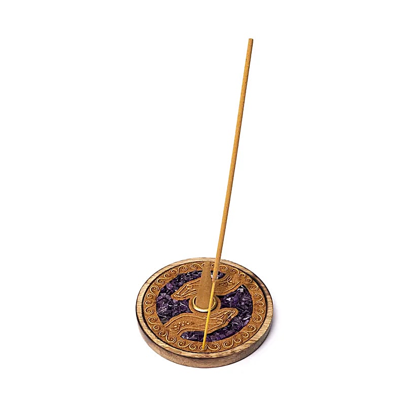 Räucherstäbchen- und Kegelhalter mit Dekoration aus heilenden Händen, angereichert mit Amethyststeinen.