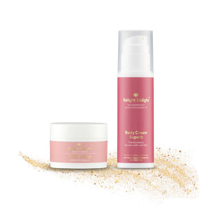 Zuerst das Body Peeling auf die feuchte Haut auftragen und sanft einmassieren. Anschließend mit Wasser abspülen und die Superb Körpercreme gleichmäßig auftragen – für eine rundum regenerierte und samtweiche Haut.